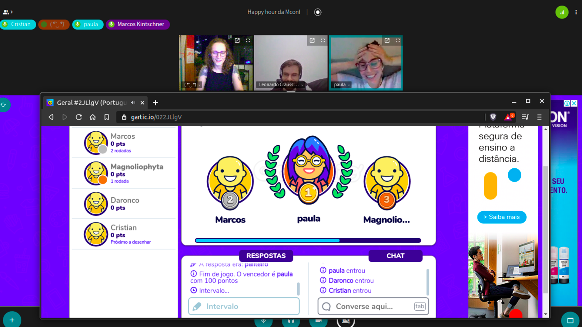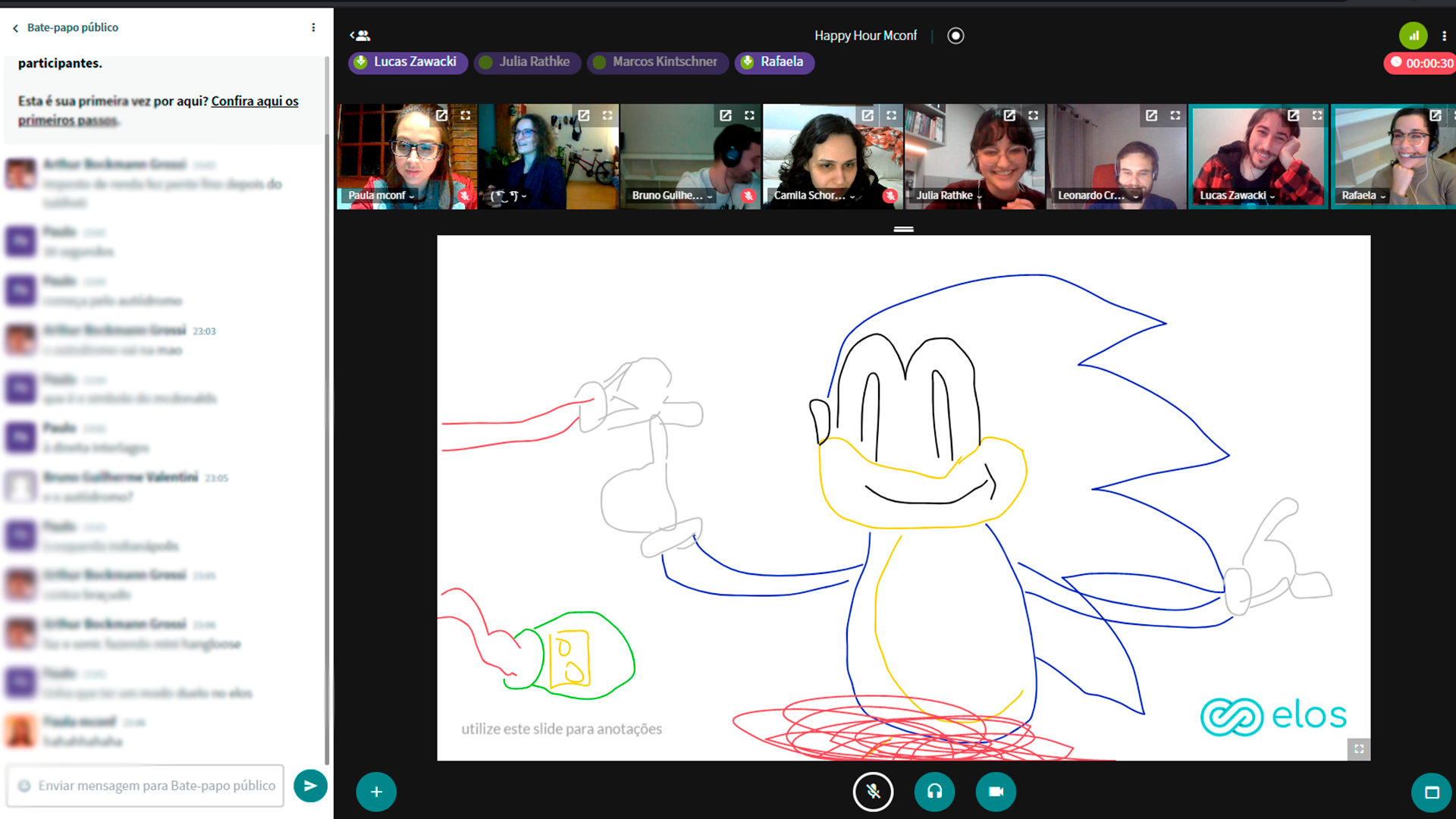 Esse é um dos momentos mais esperados pela nossa equipe. A cada happy hour, uma diversão diferente, novas conversas e integração entre todos os participantes. Isso tudo já parece ótimo, né? Mas o melhor é que através do Elos, cada encontro é realizado com dinâmicas diferentes. Jogos online (somos viciados em Gartic), desenhos no quadro branco e até rodas de cantoria utilizando o compartilhamento de vídeo já rolaram por aqui!
