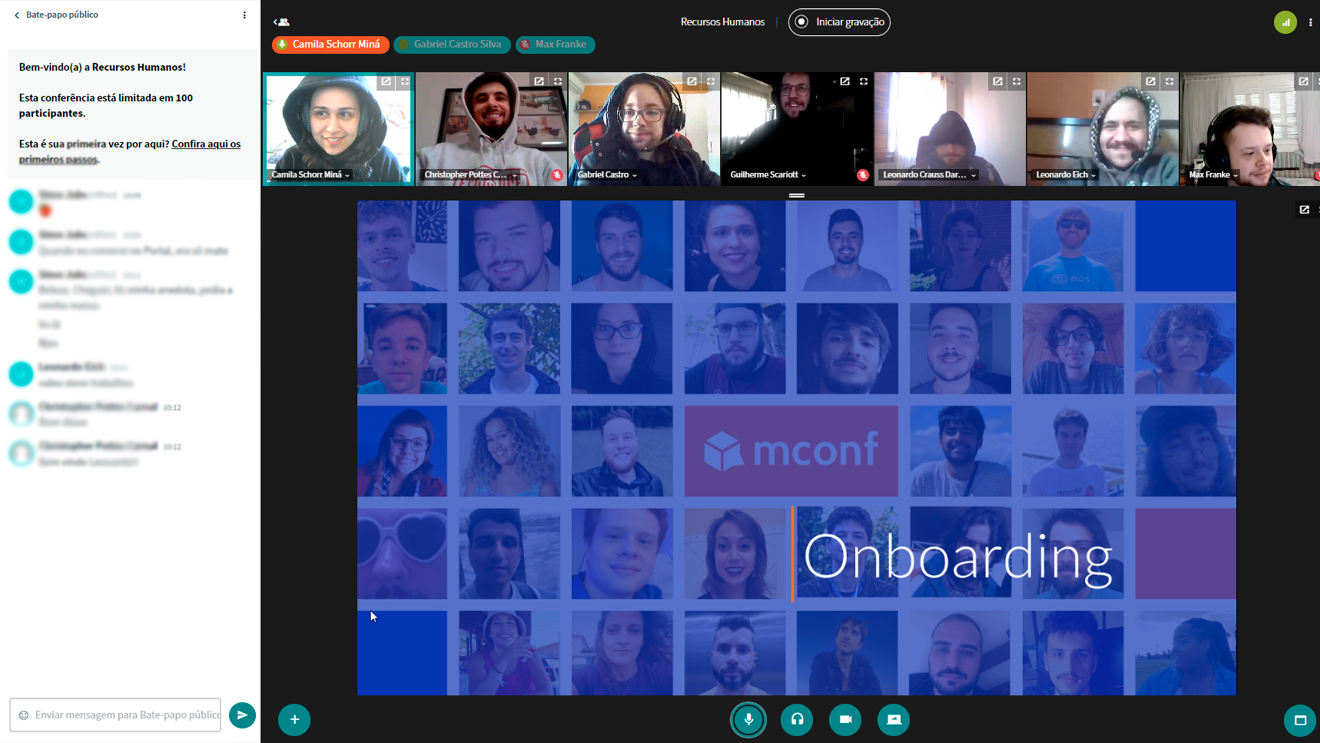 Assim que um(a) novo(a) funcionário(a) ingressa na empresa, antes mesmo de ter contato com sua nova equipe de trabalho, é feita uma primeira reunião de onboarding. Conduzida pelo time de RH e Marketing, a ideia desse encontro é fazer com que a nova pessoa já se sinta parte do time, mostrando algumas rotinas e processos de trabalho, apresentando a história e os valores da Mconf, além de promover momentos de divertimento e integração.