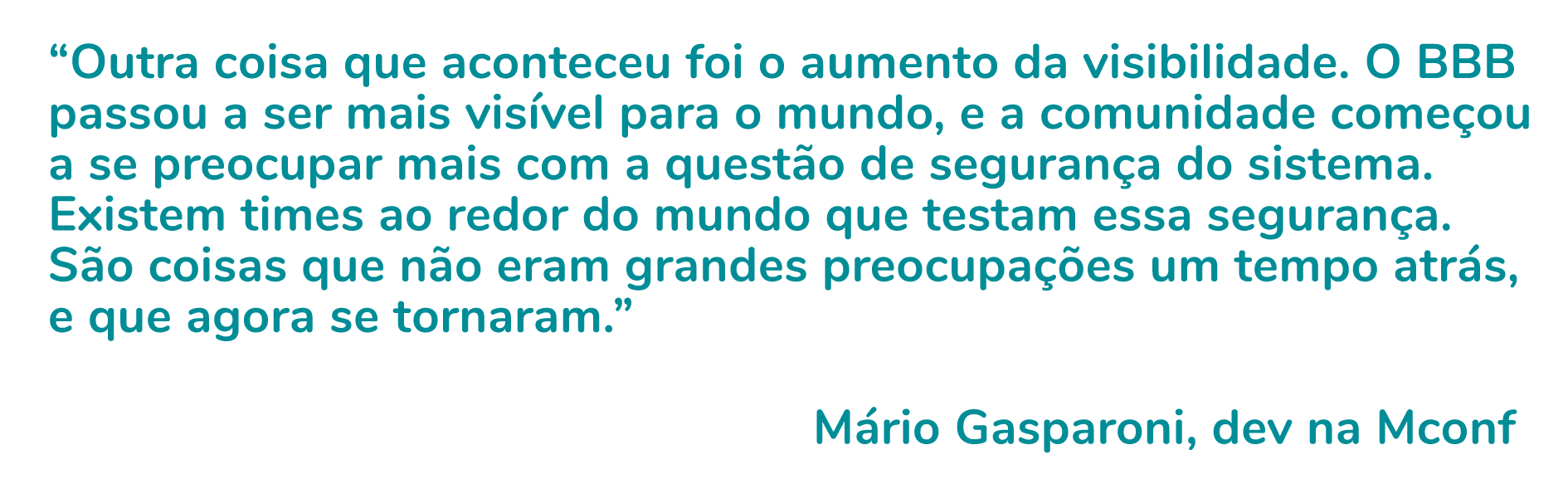 Durante o bate-papo entre os desenvolvedores, a questão do tempo limitado foi consenso na hora de apontar o principal desafio do novo release. Mário Gasparoni apontou que o 2.3 começou a ser desenvolvido em meio às demandas ainda existentes do BigBlueButton 2.2.