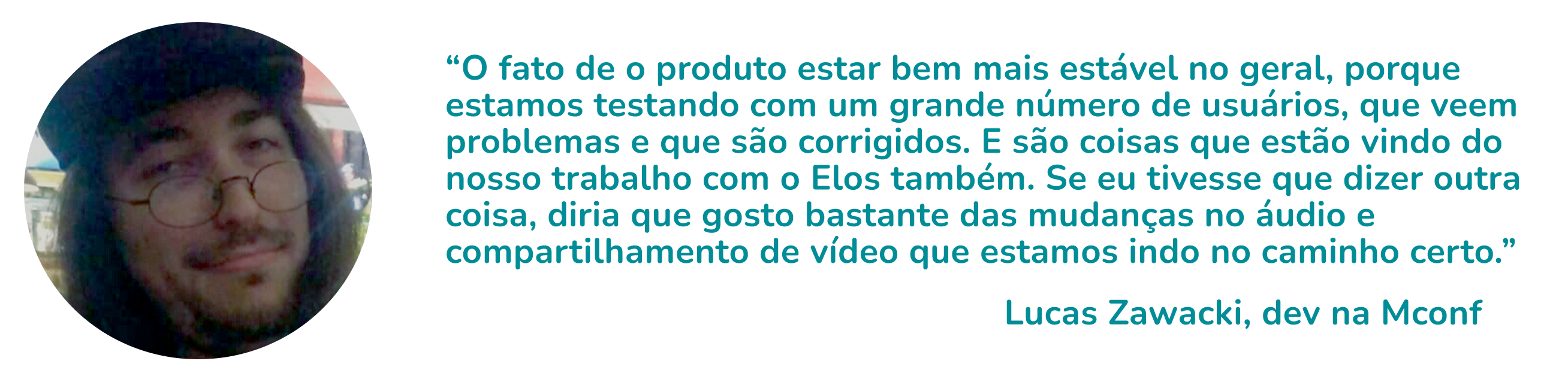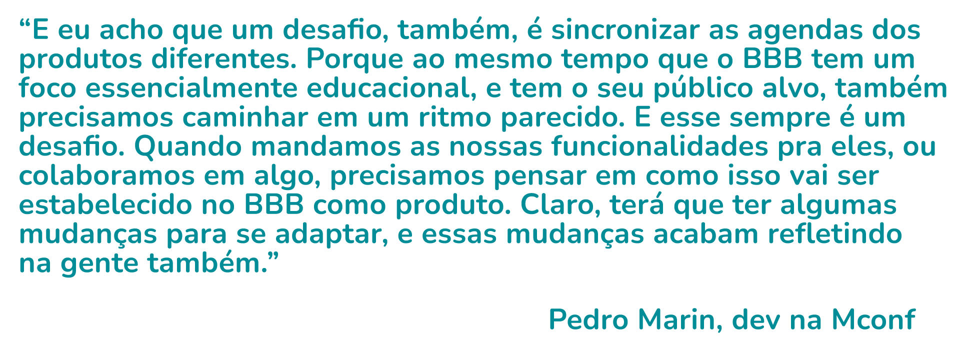 Por fim, o desenvolvedor Pedro Marin destacou que, para ele, um dos grandes desafios é o entendimento de que o Elos é um solução baseada em BigBlueButton, com sua própria visão de produto e público-alvo, na hora de sincronizar as agendas e funcionalidades.