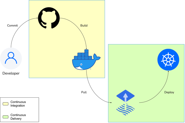 Com as duas outras ferramentas nós temos as partes de integração contínua e de entrega contínua completas. Para a implantação contínua, decidimos utilizar uma ferramenta especialmente adequada para ambientes Kubernetes: o Flux.