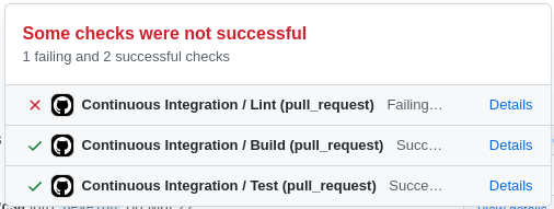 Com o uso do GitHub Actions, nós construímos todo o nosso CI. Através desta ferramenta, cada aplicação irá rodar automaticamente o formatador de código, os testes automatizados e o build da aplicação, informando ao desenvolvedor se houve algum problema com essas validações (algum teste falhou, o código não está formatado corretamente ou a aplicação não está sendo construída adequadamente).