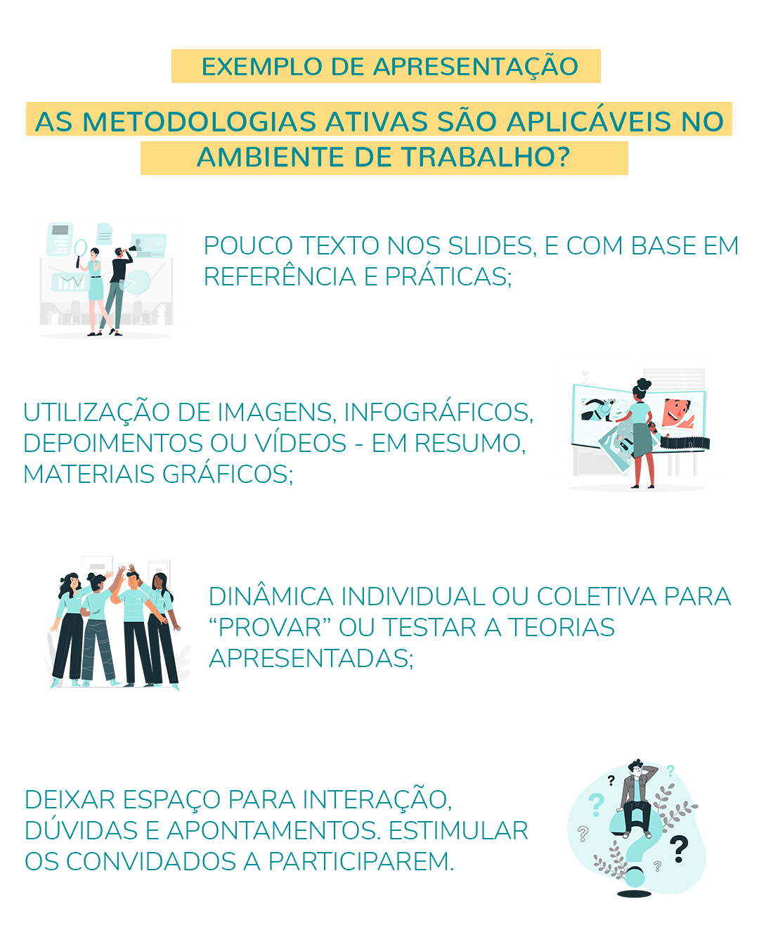 Colaborar torna tudo mais fácil, e o resultado é muito mais proveitoso, não é mesmo!? Não deixe de incentivar que os participantes interajam, discutam entre si, e colaborem para atingir algum resultado. Isso pode ser feito por meio de dinâmicas - como mencionamos lá no começo, por exemplo.